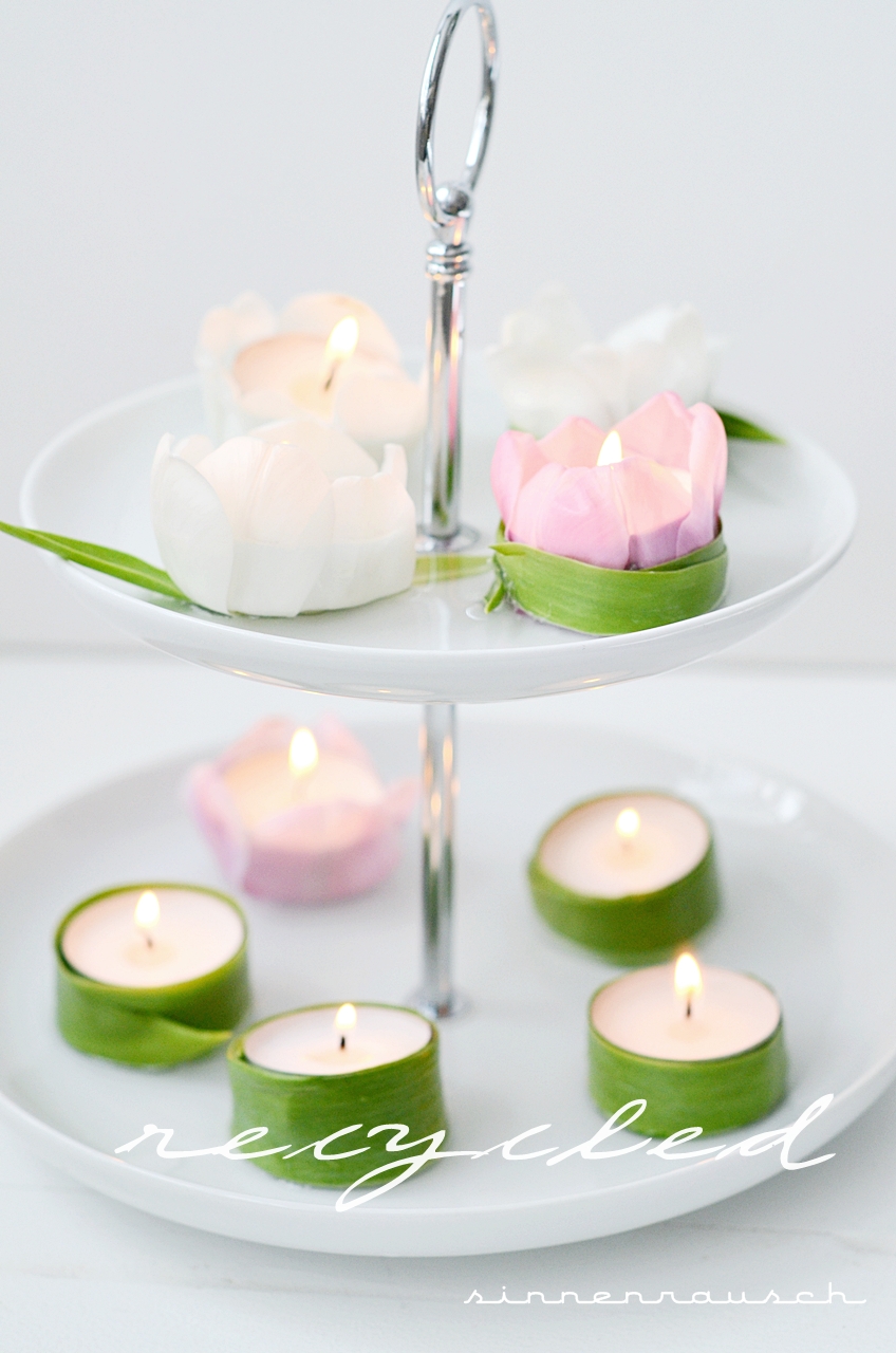Leider ist die Freude dann aber auch immer nur von kurzer Dauer und als diesmal die hübschen Tulpen ihre Köpfe hingen ließen, kam mir die Idee, die Blüten einfach zu “recyceln”.