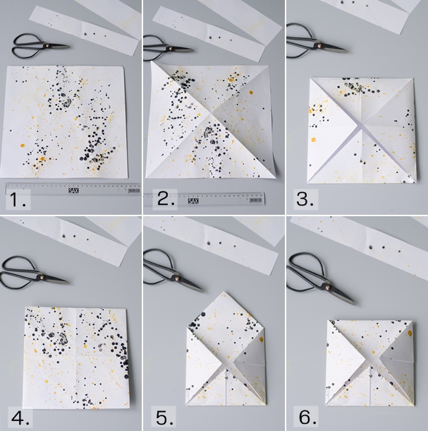 - Die vierte Ecke nach hinten falten und vorne, damit es hält, ein kleines Stück Papier hinter die drei gefalteten Ecken kleben.